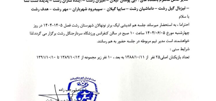 به گزارش روابط عمومی هیات فوتبال شهرستان رشت، کمیته مسابقات این هیات اعلام کرد: جلسه هماندیشی لیگ برتر نونهالان شهرستان رشت روز چهارشنبه ۵ شهریورماه، از ساعت ۱۰ صبح در سالن کنفرانس ورزشگاه سردارجنگل رشت برگزار خواهد شد. در این جلسه، جزئیات مربوط به شرایط حضور تیمها و ضوابط برگزاری مسابقات مورد بررسی قرار میگیرد.