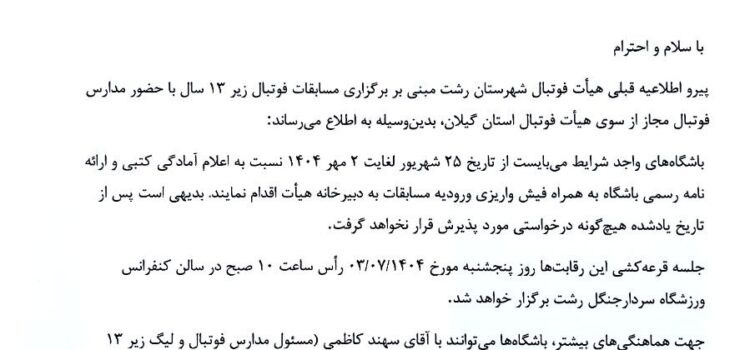 به گزارش روابط عمومی هیات فوتبال شهرستان رشت، ثبتنام تیمهای متقاضی حضور در رقابتهای فوتبال ۱۳ سال این شهرستان آغاز شد. بر اساس اعلام این هیات، باشگاههای واجد شرایط از ۲۵ شهریور لغایت ۲ مهر ۱۴۰۴ فرصت دارند با ارائه نامه رسمی باشگاه و فیش واریزی ورودیه، آمادگی خود را جهت شرکت در مسابقات به